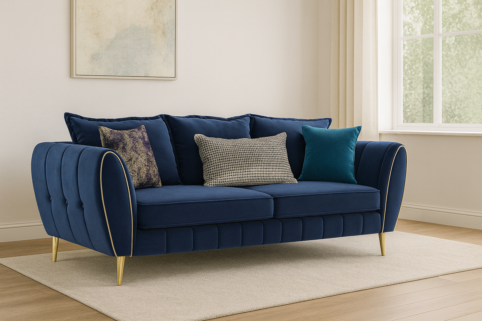The Midnight Luxe Sofa is designed to stand out with its rich navy upholstery, gold accents, and modern silhouette. Featuring plush cushions and tailored stitching, it delivers both striking style and everyday comfort — perfect for those who want a statement piece in their living space.
