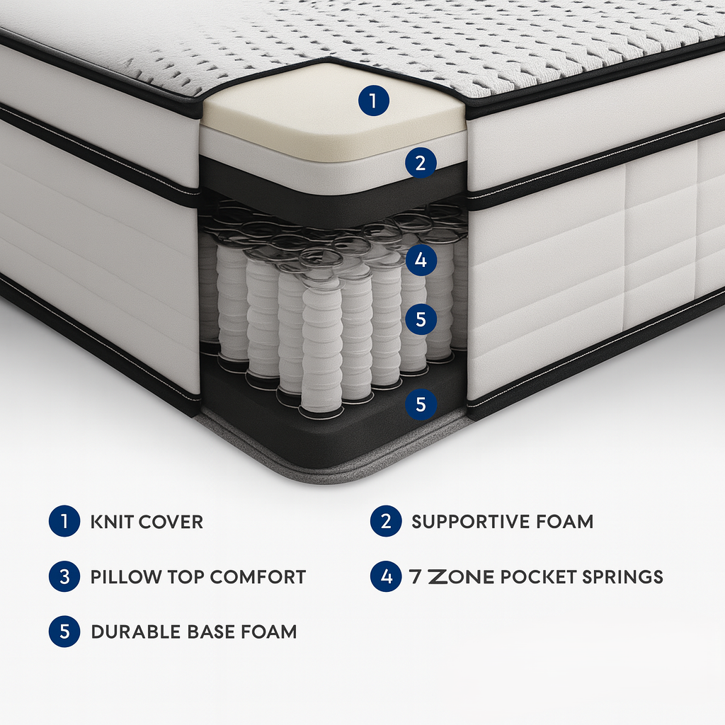 Drift into a deeper sleep with our Pillow Top Mattress, expertly designed for those who seek the perfect balance of plush comfort and responsive support. Available in 1000, 2000, and 3000 individually wrapped pocket springs, this mattress adapts to your body for a truly tailored sleeping experience.